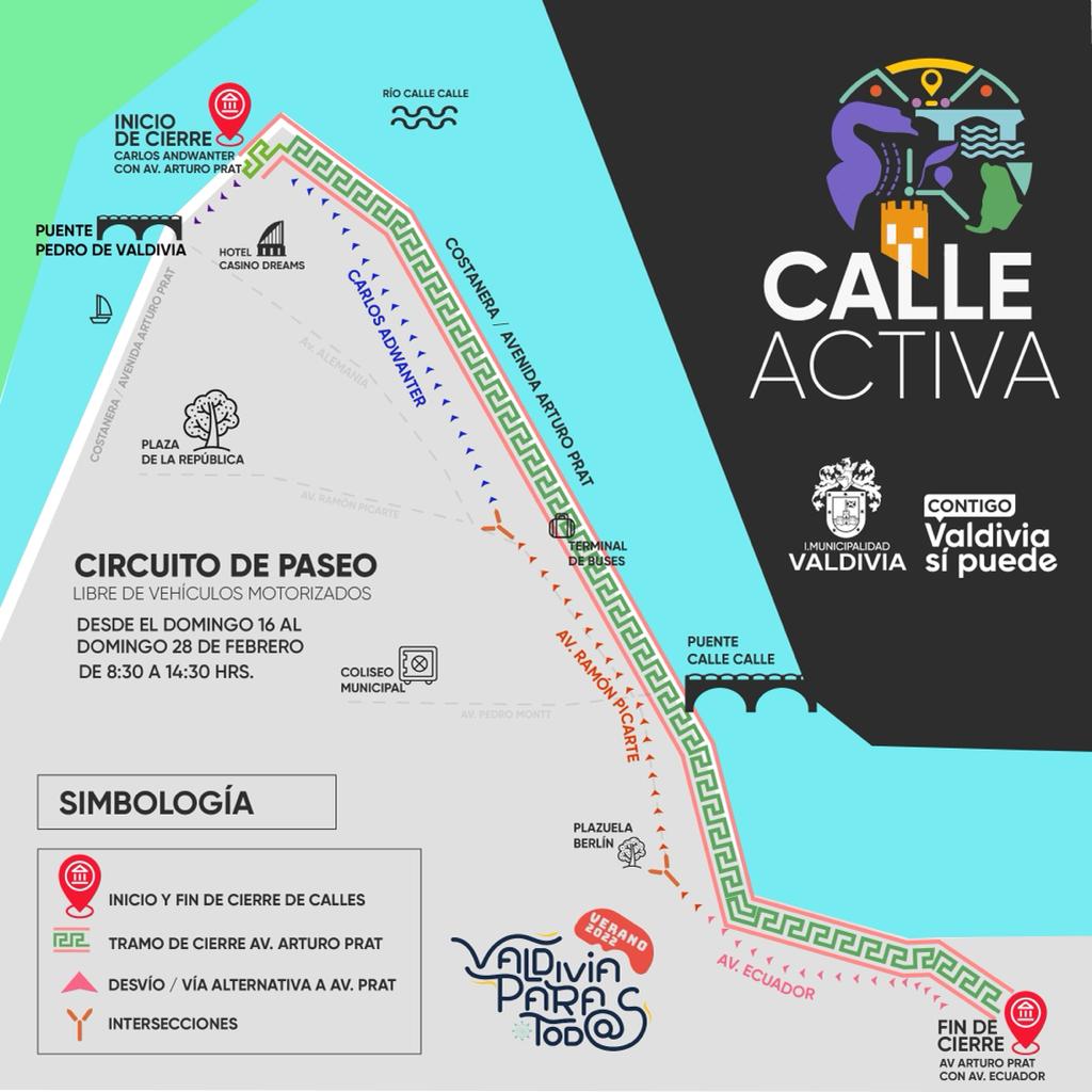 “Calle Activa” es el nombre de la iniciativa que está impulsando la Municipalidad de Valdivia para transformar un tramo de la calzada de la costanera Av. Arturo Prat en un paseo libre de vehículos motorizados. La idea es abrir estos espacios para la práctica de actividades deportivas y recreativas. La determinación se ejecutará a contar del próximo domingo 16 de enero (como marcha blanca) y se hará efectiva entre las calles Carlos Anwandter y Ecuador, entre las 9 y 14 horas.