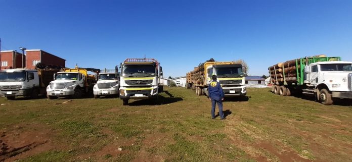 En el lugar de la fiscalización, personal policial controló a quienes tripulaban los camiones, realizando los detectives de la PDI las primeras diligencias de este caso, que permitió incautar 6 camiones de diferentes marcas. De estos móviles, cuatro tenían grúa autocargable y con carro auxiliar, avaluados en la suma de 350 millones de pesos cada uno, 2 skidder, avaluados en la suma de 80 millones de pesos y 280 trozos de madera de pino en bruto, avaluados por la empresa Forestal Arauco en la suma de 25 millones de pesos.