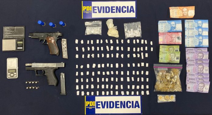 La PDI de Valdivia logró desarticular la tarde de este jueves un punto de venta de drogas en Población Pablo Neruda de esta ciudad, deteniendo a un menor de edad de 17 años e incautando cocaína base, dos pistolas a fogueo, de las cuales una estaba adaptada para disparar, municiones artesanales, dinero en efectivo y artículos asociados a la venta de droga.