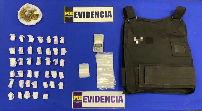 Producto de la entrada y registro en los dos inmuebles, la PDI logró incautar 70,25 gramos de cannabis sativa, una balanza digital, elementos de dosificación y un chaleco antibalas.
