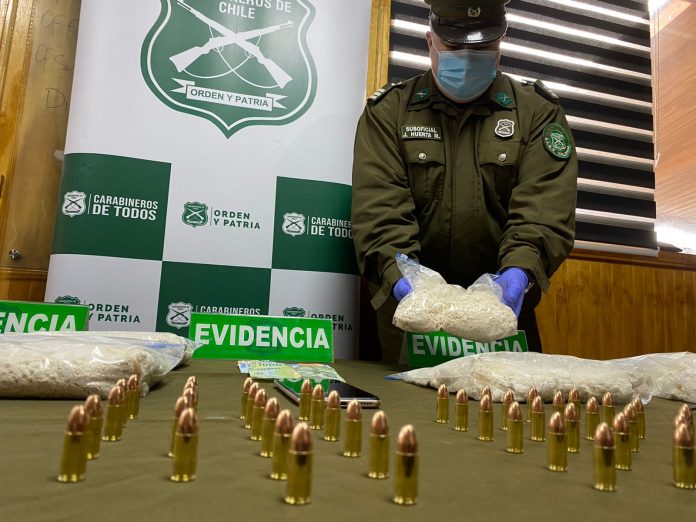 Al interior del auto encontraron pasta base de cocaína, además de 48 cartuchos de nueve milímetros sin percutir, ocho miguelitos, dos teléfonos celulares y $93 mil pesos en dinero en efectivo.