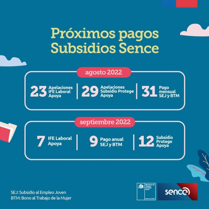 El Servicio Nacional de Capacitación y Empleo, Sence, informó las próximas fechas de pagos de los subsidios al empleo: IFE Laboral Apoya, Protege Apoya, Subsidios al Empleo Joven (SEJ) y Bono al Trabajo de la Mujer (BTM).