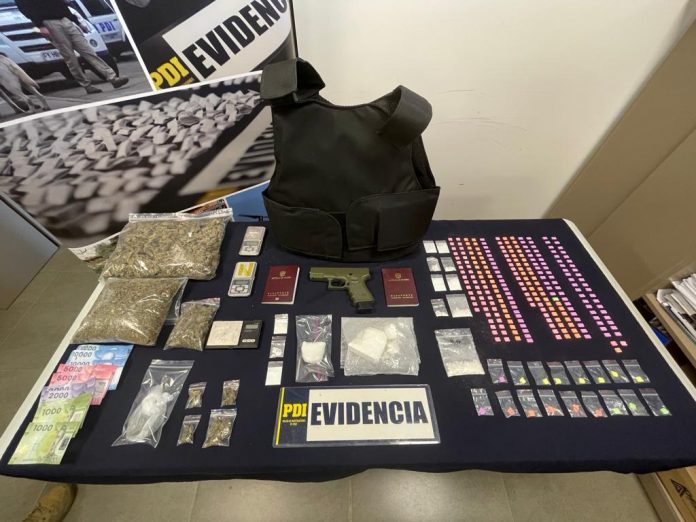 Lo incautado corresponde más de un kilo de droga entre cannabis sativa y clorhidrato de cocaína; junto a 259 comprimidos de MDMA o éxtasis; un contenedor con lidocaína; una pistola a balines; y $60 mil pesos en dinero en efectivo, todo lo anterior avaluado en casi $16 millones de pesos.