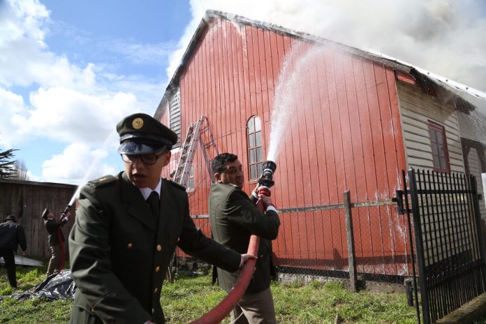 Así lo explicó el comandante del Cuerpo de Bomberos de Crucero, René Namillanca, quien relató que “todavía estamos acá trabajando en el templo católico del sector de Trapi. Nosotros estábamos en formación para participar del desfile de Fiestas Patrias del sector, cuando se dio la alarma de incendio”.