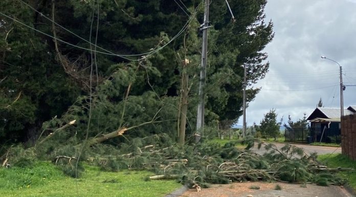 Y continuó: “Hoy por el viento se desprendió un pino a la mitad, cayendo encima del tendido público y haciendo destrozos en uno de los postes de luz que se partió y cayó la luminaria. Debido a esto, todo el sector está sin energía eléctrica, y nos llegó un aviso de Saesa en que informan que cerca de las 14.30 horas van a concurrir al sector para analizar la situación, por lo que no tenemos horario estimado de reposición”.