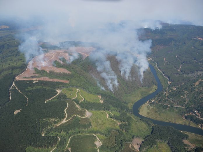 El siniestro se desarrolla principalmente en zonas de desechos forestales y plantaciones de eucaliptos. Se mantienen dos grandes focos activos separados precisamente por el río Futa.