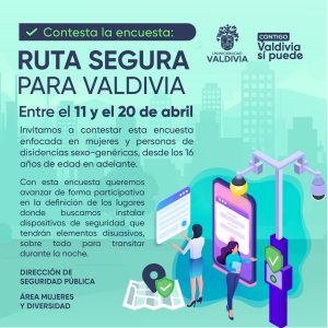 La Municipalidad de Valdivia dio el vamos a una encuesta que servirá como insumo para definir una Ruta Segura, donde se instalarán postes inteligentes que contarán con elementos que aporten a la seguridad de las personas durante horarios nocturnos. La aplicación de la encuesta se enfoca en mujeres y personas de disidencias sexo-genéricas, de los 16 años de edad en adelante.