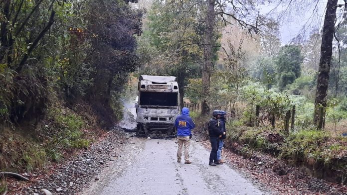 En horas de esta tarde un camión forestal, en el sector Pichihue en la comuna de Los Lagos, fue abordado por siete sujetos encapuchados e intimidado con armas largas, quienes posteriormente prendieron fuego al vehículo.