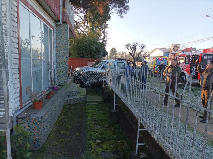 La unidad de rescate de la Primera Compañía de Bomberos fue despachada al lugar donde el personal constató el accidente de dos vehículos menores, resultando uno de ellos incrustado dentro de un domicilio.