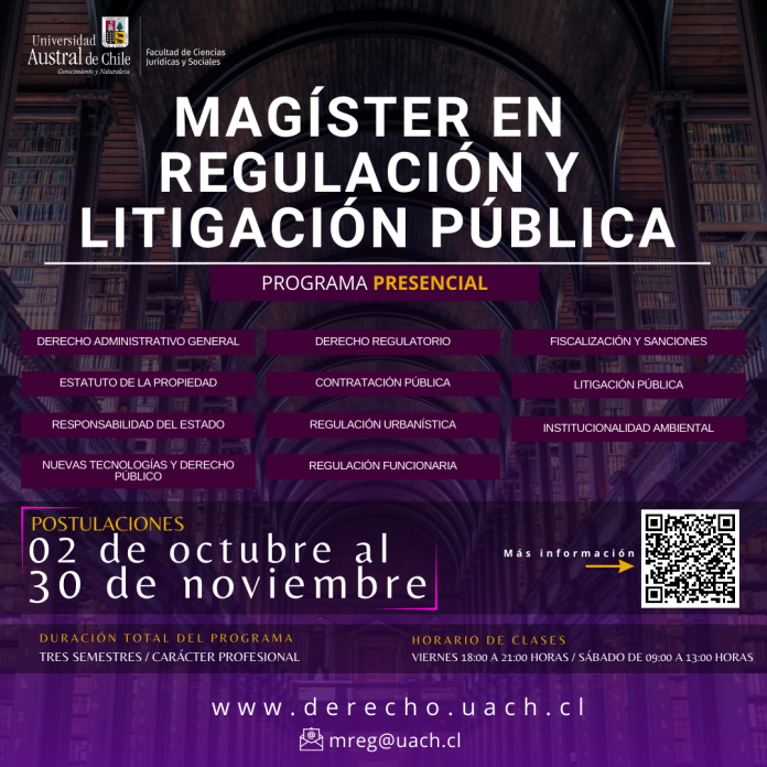 La Escuela de Graduados de la Facultad de Ciencias Jurídicas y Sociales UACh, abrirá postulaciones al programa de Magíster en Regulación y Litigación Pública, a partir del 2 de octubre y hasta el 30 de noviembre de 2023.