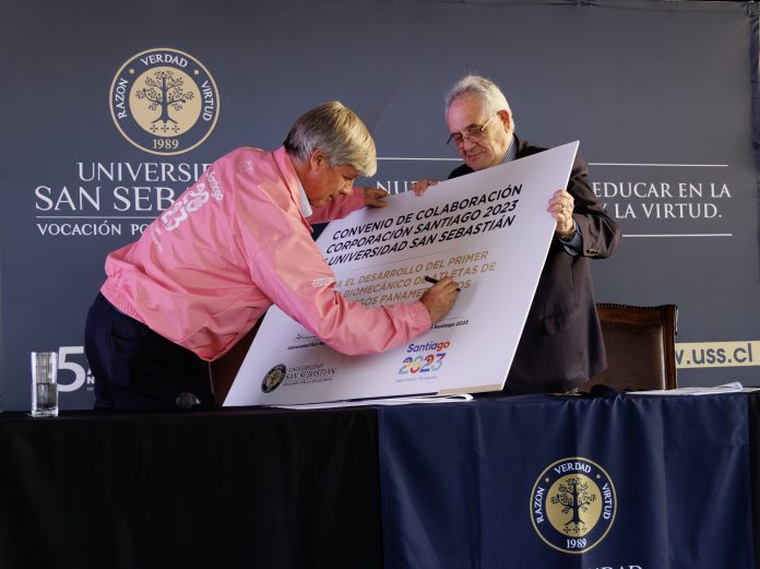 Harold Mayne-Nicholls, director ejecutivo de Santiago 2023, junto al rector de la Universidad San Sebastián, Hugo Lavados Montes, firmaron un acuerdo de colaboración para realizar el primer estudio biomecánico de atletas en los Juegos Panamericanos.
