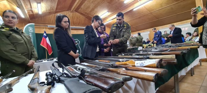 La Ministra del Interior y Seguridad Pública, Carolina Tohá, la Subsecretaria de Desarrollo Regional y Administrativo, Francisca Perales, la Delegada Presidencial Regional de Los Ríos, Carla Peña y el Jefe de Zona Carabineros Los Ríos, General Patricio Faunes Salas, junto a parlamentarios, presidieron la muestra de armas largas y cortas, que serán remitidas al Depósito Central de OS11 en la Región Metropolitana, para su respectiva destrucción.
