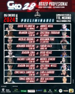 La cartelera preliminar y los combates principales se llevarán a cabo este sábado 6 de enero de 2024 en el gimnasio del Colegio Teniente Merino, ubicado en Valle Hondo N°2915. El inicio de la jornada está programado para las 19 horas.