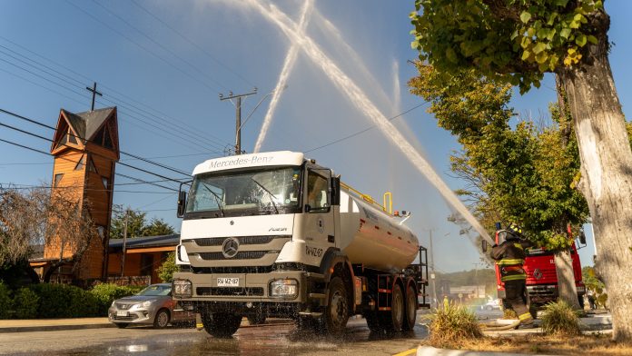 Además, el Cuerpo de Bomberos de Paillaco dio la bienvenida a la nueva flota de vehículos con una cortina de agua en el frontis de la municipalidad.