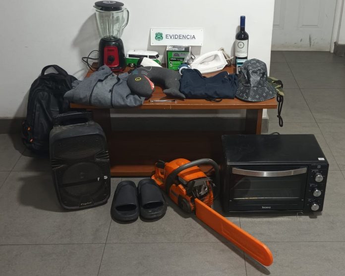 Junto con la aprehensión, el personal policial recuperó una motosierra, electrodomésticos, vestimentas y especies menores que el ladrón mantenía apiladas y listas para sacar.