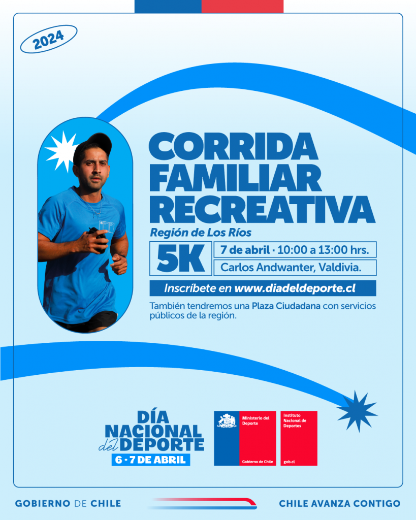 El Día del Deporte 2024 en Los Ríos tiene como evento principal la Corrida Familiar del día domingo 7 de abril, que comenzará la entrega de poleras a las primeras 600 personas inscritas en diadeldeporte.cl, desde las 09:30 de la mañana. La corrida contará con una Plaza Ciudadana en la que servicios públicos se encontrarán disponibles para todas las personas que concurran al sector de largada y meta, en la Costanera de Valdivia (Avenida Arturo Prat esquina Carlos Anwandter).