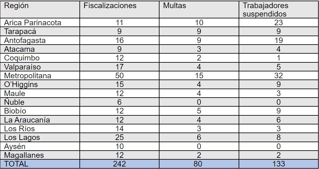 Respecto de la jornada de este miércoles, el siguiente es el desglose regional de fiscalizaciones, multas y trabajadores suspendidos: