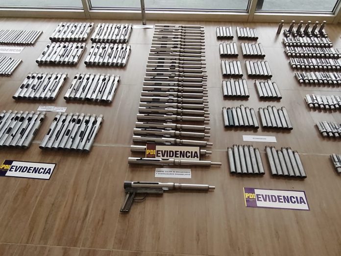 Con respecto a lo incautado, desde la PDI detallaron que se trata de un arma completa de fabricación artesanal de 9 milímetros; 500 cartuchos de 9 milímetros; 31 armazones de arma de fuego artesanal; 68 cañones estriados de pistola calibre 9 milímetros, 69 piezas metálicas de tipo empuñadura, y una pistola 9 milímetros con su cargador.