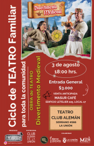 Para culminar el Ciclo de Teatro Familiar de este año, se presentará la obra “Divertimento Medieval”. Este último montaje es un viaje al pasado, donde nos reciben personajes como: bufones burlescos, reyes malhumorados, caballeros en búsqueda de la perfección, druidas con sus sabios consejos y juglares interpretando bellas melodías, que despiertan en los espectadores la magia de la imaginación a través de una historia llena de mensajes y alegría. Utilizando el estilo del conteur mimeur, una actriz en compañía de un músico multi instrumentista van creando la atmosfera y desarrollando los personajes de la historia.