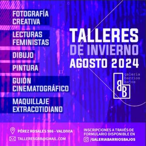 En la cuenta de Instagram @galeriabarriosbajos se encuentra la información detallada sobre cada taller, y también el enlace al formulario de inscripción. Las actividades serán en Galería Barrios Bajos, ubicada en Pérez Rosales 986, Valdivia; y concluirán con una exposición colectiva final que se llevará a cabo durante la primera quincena de septiembre.