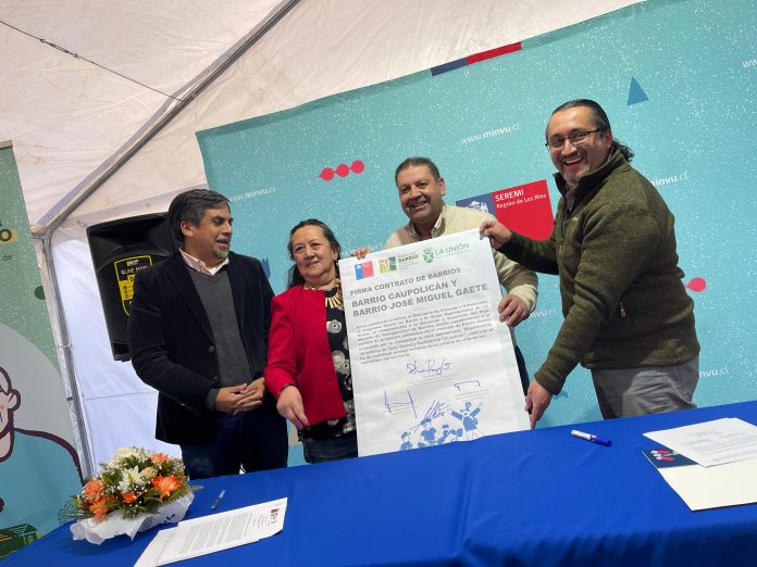 Con la firma de dirigentes y autoridades se dio el vamos al contrato de obras del Barrio Caupolicán y José Miguel Gaete en el marco del Programa Quiero Mi Barrio en La Unión. Ello permitirá ejecutar el mejoramiento entorno de Sede Vecinal y multicancha del sector por una inversión de 444 millones de pesos.
