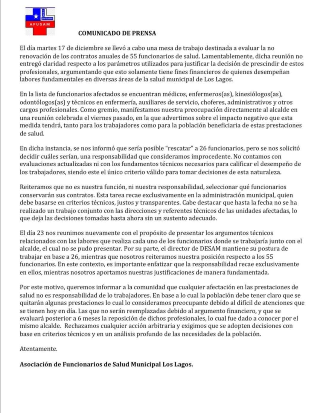 La Asociación advierte que esta decisión tendrá consecuencias negativas tanto para los trabajadores como para los usuarios de las prestaciones de salud municipal. “Advertimos sobre el impacto negativo que esta medida tendrá, tanto para los trabajadores como para la población beneficiaria de estas prestaciones de salud”, afirmaron.