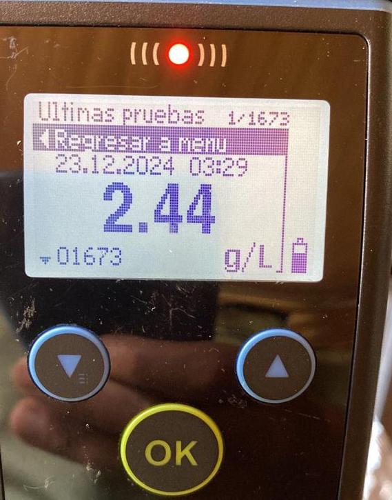 “Al realizar el control correspondiente, el examen respiratorio arrojó un resultado de 2.44 gramos por litro de alcohol en la sangre, superando ampliamente los límites permitidos”, explicó el oficial.