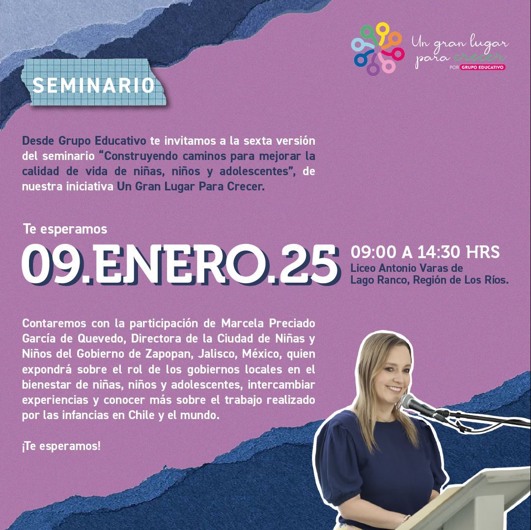 Este evento, a realizarse el jueves 9 de enero en Lago Ranco, busca generar un espacio de discusión en torno a la participación activa de la infancia en la formulación de políticas públicas y contará con la destacada participación de Marcela Preciado García de Quevedo, Directora de la Ciudad de Niñas y Niños del Gobierno de Zapopan, México.
