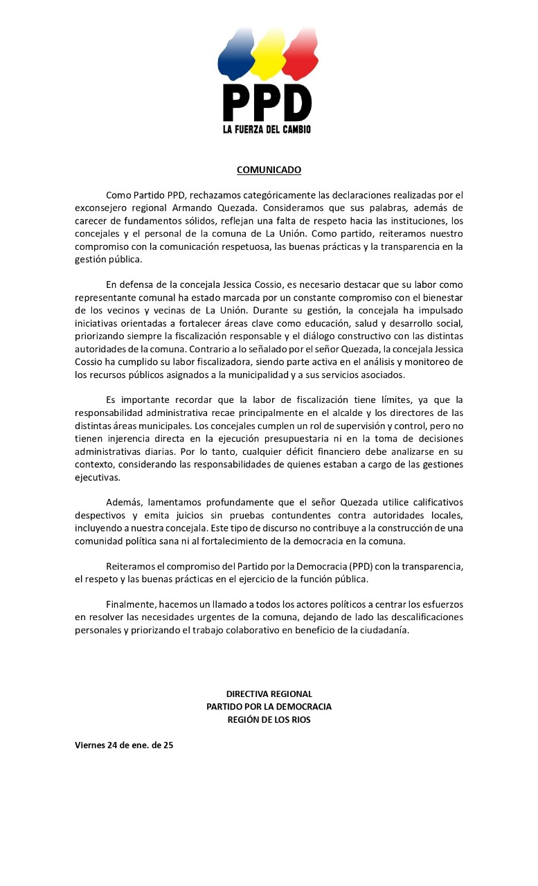 En respuesta a las afirmaciones de Armando Quezada, el PPD señaló: “Consideramos que sus palabras, además de carecer de fundamentos sólidos, reflejan una falta de respeto hacia las instituciones, los concejales y el personal de la comuna de La Unión”. Reiteraron su compromiso con la comunicación respetuosa, la transparencia y las buenas prácticas en la gestión pública.