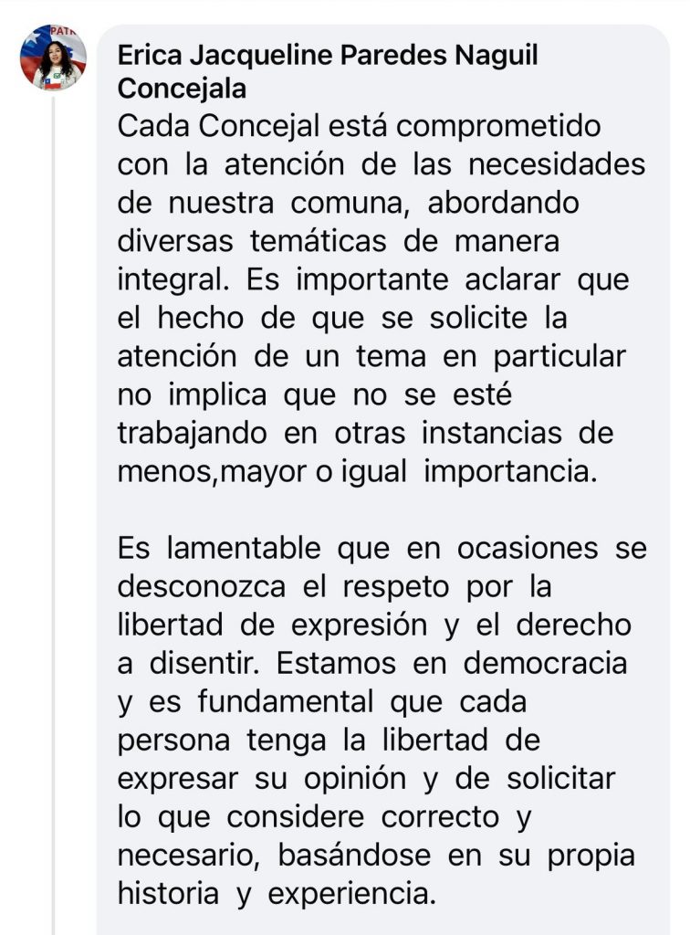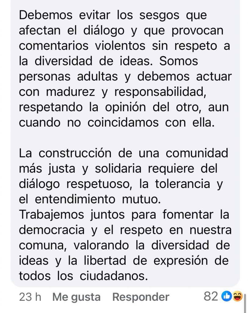 Finalmente, Paredes hizo un llamado a la comunidad y a las autoridades a construir un espacio de respeto y entendimiento mutuo. “La construcción de una comunidad más justa y solidaria requiere del diálogo respetuoso, la tolerancia y el entendimiento mutuo. Trabajemos juntos para fomentar la democracia y el respeto en nuestra comuna, valorando la diversidad de ideas y la libertad de expresión de todos los ciudadanos”, concluyó.