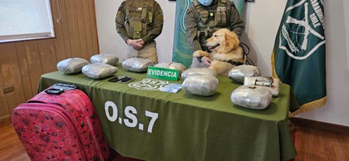 Gracias al trabajo del OS7 de Carabineros Valdivia y al can detector Gema, se logró incautar más de 13 kilos de droga, incluyendo pasta base y clorhidrato de cocaína. El hallazgo se realizó durante un control carretero en La Unión, tras lo cual se efectuó un seguimiento hasta Puerto Montt, donde la responsable del equipaje fue detenida.