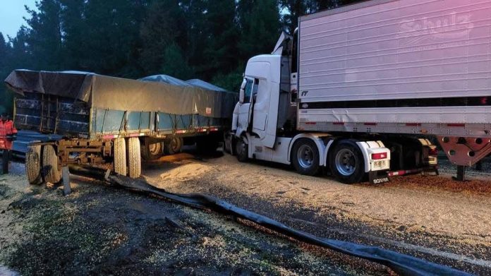 Una colisión por alcance entre dos camiones de carga registrada la mañana de este sábado en el kilómetro 813 de la Ruta 5 Sur, en la comuna de Máfil, obligó a implementar un cierre parcial de la carretera en dirección norte a sur. El accidente, cuyas causas aún son materia de investigación, dejó ambos vehículos atravesados sobre la calzada, lo que generó una importante interrupción del tránsito.