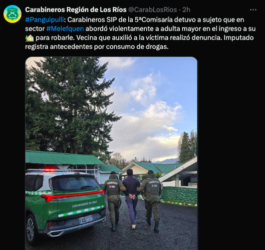 Un individuo fue detenido este martes en el sector de Melefquen, comuna de Panguipulli, luego de que agrediera a una mujer de la tercera edad para robarle en la entrada de su vivienda. La rápida denuncia de una vecina permitió el auxilio de la víctima y la captura del imputado, quien mantiene antecedentes por consumo de drogas.