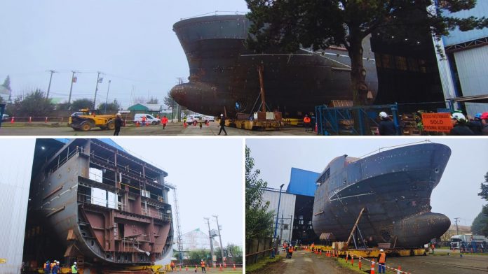 Esta operación, que consistió en el movimiento de una pieza de 630 toneladas desde la planta 3 a la planta 1 del astillero, incluyó cruzar Avenida España en el sector de Las Ánimas, cautivando a los transeúntes que circulaban por el sector. De esta manera, la embarcación completó ya el 60% de su estructura total que se espera terminar este año.