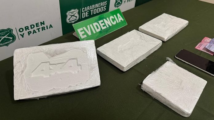 La fiscalización se realizó en horas de la madrugada en el peaje troncal Cuatro Vientos, ubicado en el kilómetro 962 de la Ruta 5, al sur de Purranque. Allí, el can detector “Gea” marcó la alerta en el asiento del pasajero, lo que llevó a los funcionarios a revisar su mochila, donde se hallaron cuatro paquetes rectangulares envueltos en papel transparente. El análisis químico confirmó que se trataba de 3 kilos 523 gramos y 400 miligramos de cocaína, droga avaluada en más de 50 millones de pesos en el mercado ilegal.