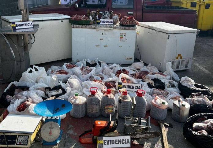 Durante la diligencia, la PDI incautó 268 kilos de carne, además de 3 máquinas congeladoras, serruchos, motosierras, prensas de carne, pesas, hachas, machetes, cuchillos de diversas dimensiones, colgadores, cabezas de animales, 35 litros de sangre de vacuno, celulares y una camioneta, todo avaluado en más de 15 millones de pesos.