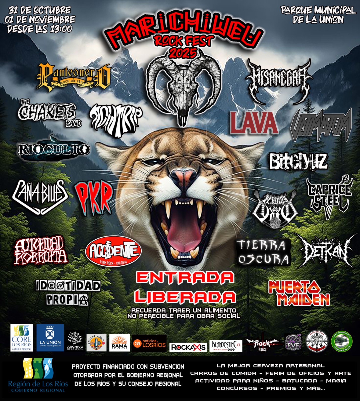 El Marichiweu Rock Fest 2025 se realizará los días 31 de octubre y 1 de noviembre en el Parque Municipal de La Unión, con entrada liberada y aporte voluntario de alimentos no perecibles. Bajo el lema “Con el rock 10 veces venceremos”, el evento reunirá a más de 18 bandas del sur de Chile que destacan por su creatividad, identidad territorial, diversidad de estilos y compromiso social, en un encuentro financiado por el Gobierno Regional de Los Ríos y su Consejo Regional, que también ofrecerá espacios para el arte local, el emprendimiento y actividades familiares.