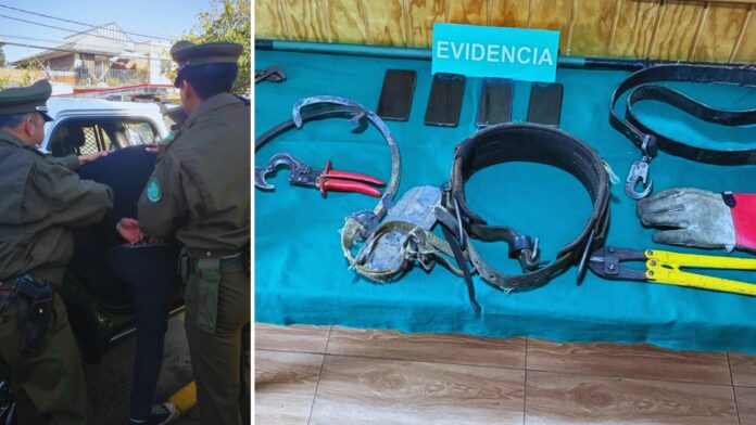 Asimismo, al inspeccionar el interior del vehículo se hallaron garras metálicas, un cinturón de cuero para ascender postes y diversas herramientas, entre ellas alicates, tenazas de corte y un napoleón, todas asociadas a intervenciones ilícitas en estructuras de alumbrado público e infraestructura eléctrica.