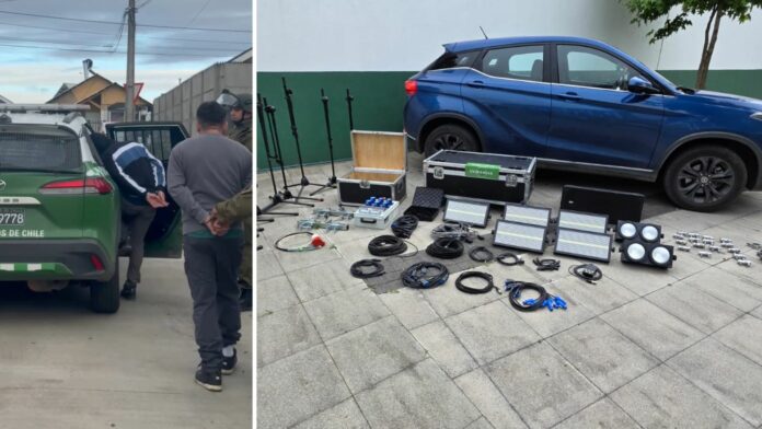 En el domicilio, el personal policial encontró la totalidad de las especies sustraídas el pasado 11 de noviembre desde un vehículo estacionado en calle O’Higgins, entre ellas 13 pedestales de micrófonos, equipamiento de iluminación profesional —como paletas LED, luces Fresnel, cables DMX y guías eléctricas— además de cables de conexión, un tablero trifásico y un módulo de sonido, elementos utilizados en producción técnica y audiovisual.