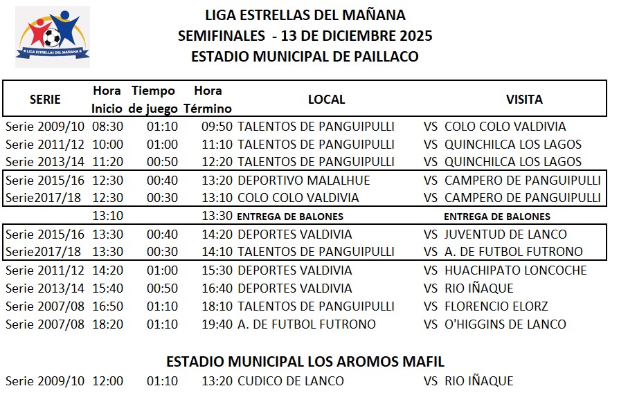 Desde tempranas horas, la acción comenzará a las 08:30 con el duelo de la serie 2009/10 entre Talentos de Panguipulli y Colo Colo Valdivia, dando inicio a una maratónica jornada que contempla encuentros en diversas categorías, desde la serie 2007/08 hasta la 2017/18. Clubes como Deportes Valdivia, Quinchilca Los Lagos, Campero de Panguipulli, A. de Fútbol Futrono y O’Higgins de Lanco animarán partidos decisivos en busca del paso a la gran final del torneo.