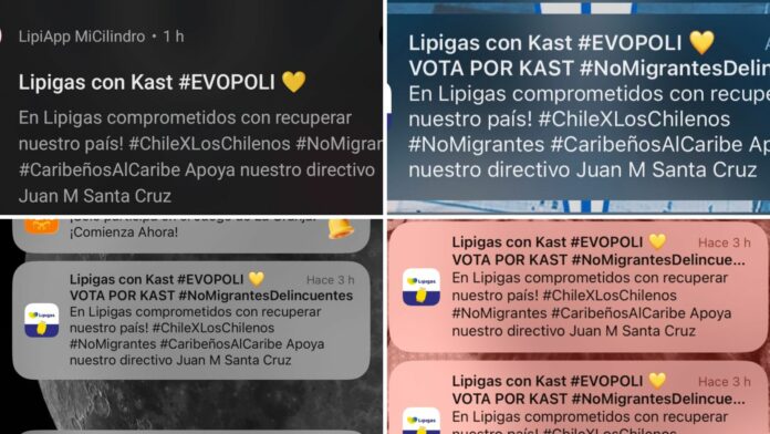 Durante la mañana de este domingo, en la antesala inmediata de la segunda vuelta presidencial, comenzaron a circular masivamente en redes sociales capturas de pantalla que evidenciarían el envío de una notificación política mediante la aplicación móvil de Lipigas. El mensaje, que llegó directamente a los teléfonos de usuarios, llamaba explícitamente a votar por el candidato del Partido Republicano, José Antonio Kast, e incluía consignas y expresiones contra la inmigración.