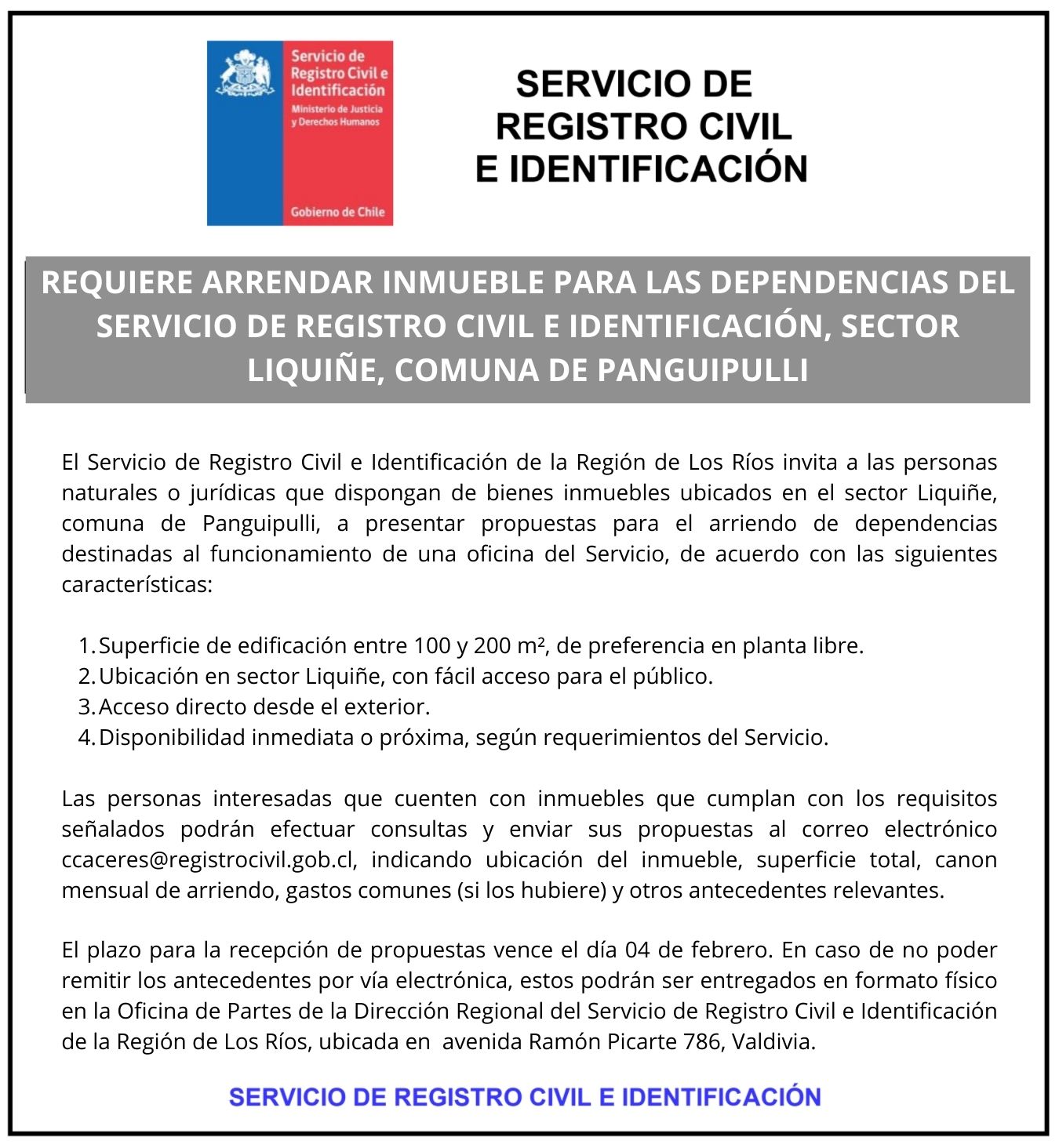 Avisos Legales Servicio de Registro Civil requiere arrendar inmueble en Liquiñe, comuna de Panguipulli Cuota FacebookTwitterPinterestWhatsApp 28 de enero de 2026 Cuota FacebookTwitterPinterestWhatsApp Html code here! Replace this with any non empty raw html code and that's it.