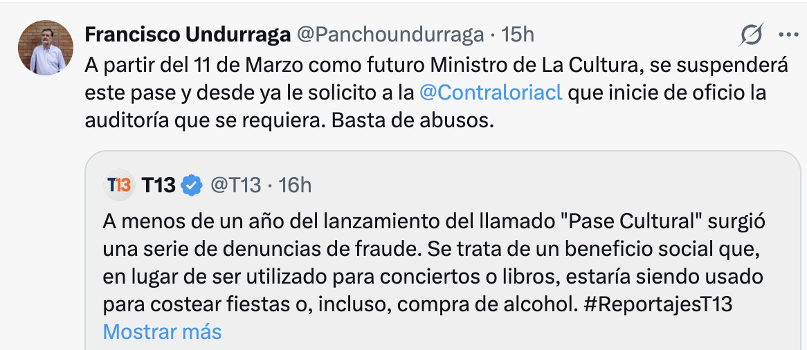 El futuro ministro de las Culturas, Francisco Undurraga, anunció la suspensión del Pase Cultural a contar del 11 de marzo y solicitó una auditoría a la Contraloría, luego de denuncias que apuntan a un eventual uso irregular del beneficio. En paralelo, el Ministerio de las Culturas presentó una denuncia ante el Consejo de Defensa del Estado para investigar responsabilidades y exigir la restitución de recursos.