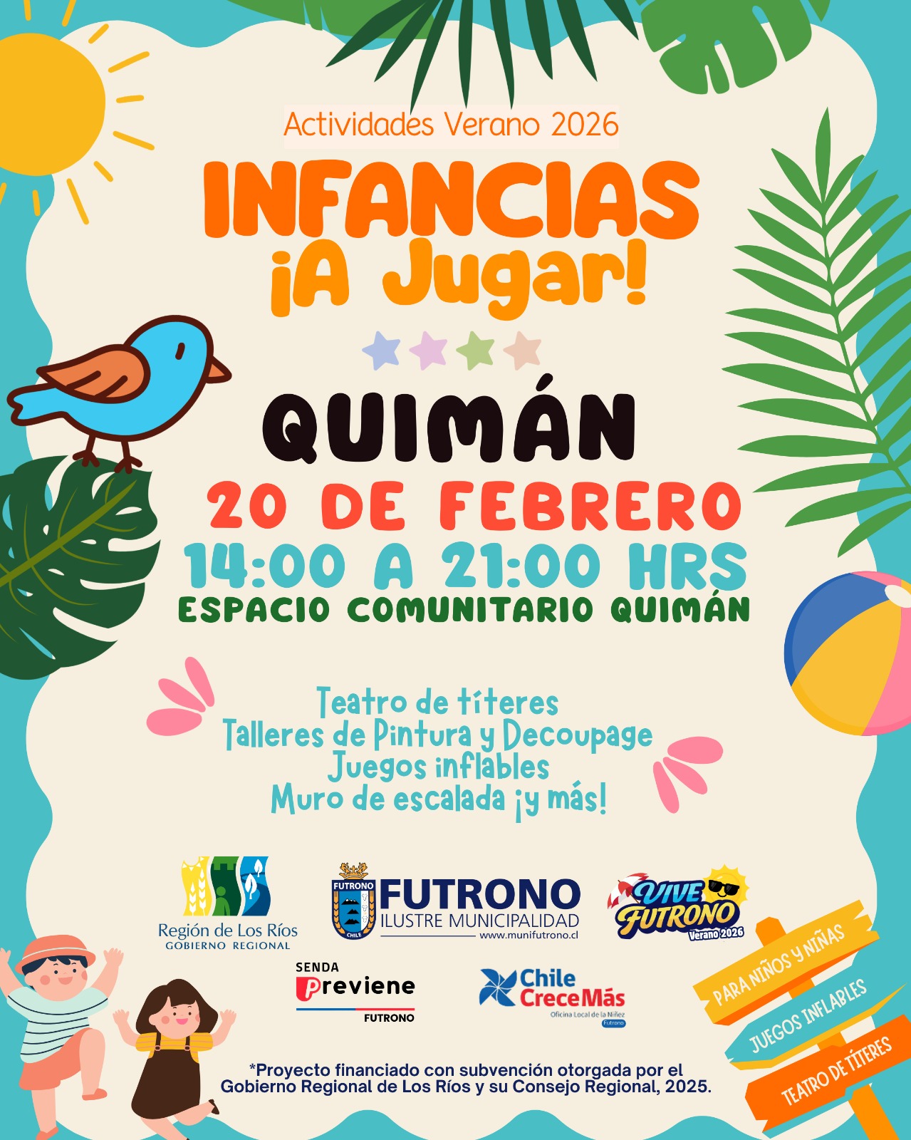El jueves 20 de febrero, desde las 14:00 y hasta las 21:00 horas, el Espacio Comunitario de Quimán será escenario de la jornada “Infancias ¡A Jugar!”, una instancia especialmente diseñada para niñas y niños, que contempla teatro de títeres, talleres de pintura y decoupage, juegos inflables y muro de escalada, entre otras actividades recreativas.