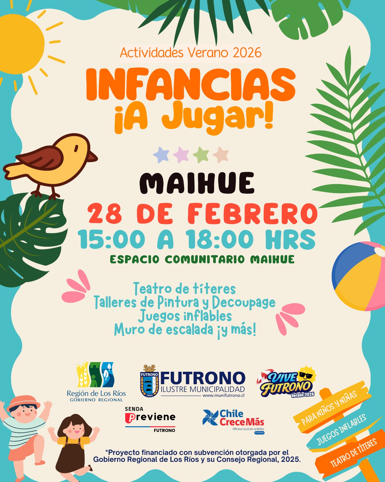 Finalmente, el 28 de febrero, el Espacio Comunitario de Maihue será punto de encuentro desde las 15:00 hasta las 18:00 horas con una nueva edición de “Infancias ¡A Jugar!”, acercando actividades recreativas y culturales a las familias del sector. Ese mismo día, a las 18:00 horas, el Centro Comunitario de Maihue presentará nuevamente el espectáculo “Murga Koli Koli”, cerrando la programación de febrero con una propuesta artística itinerante de carácter comunitario.