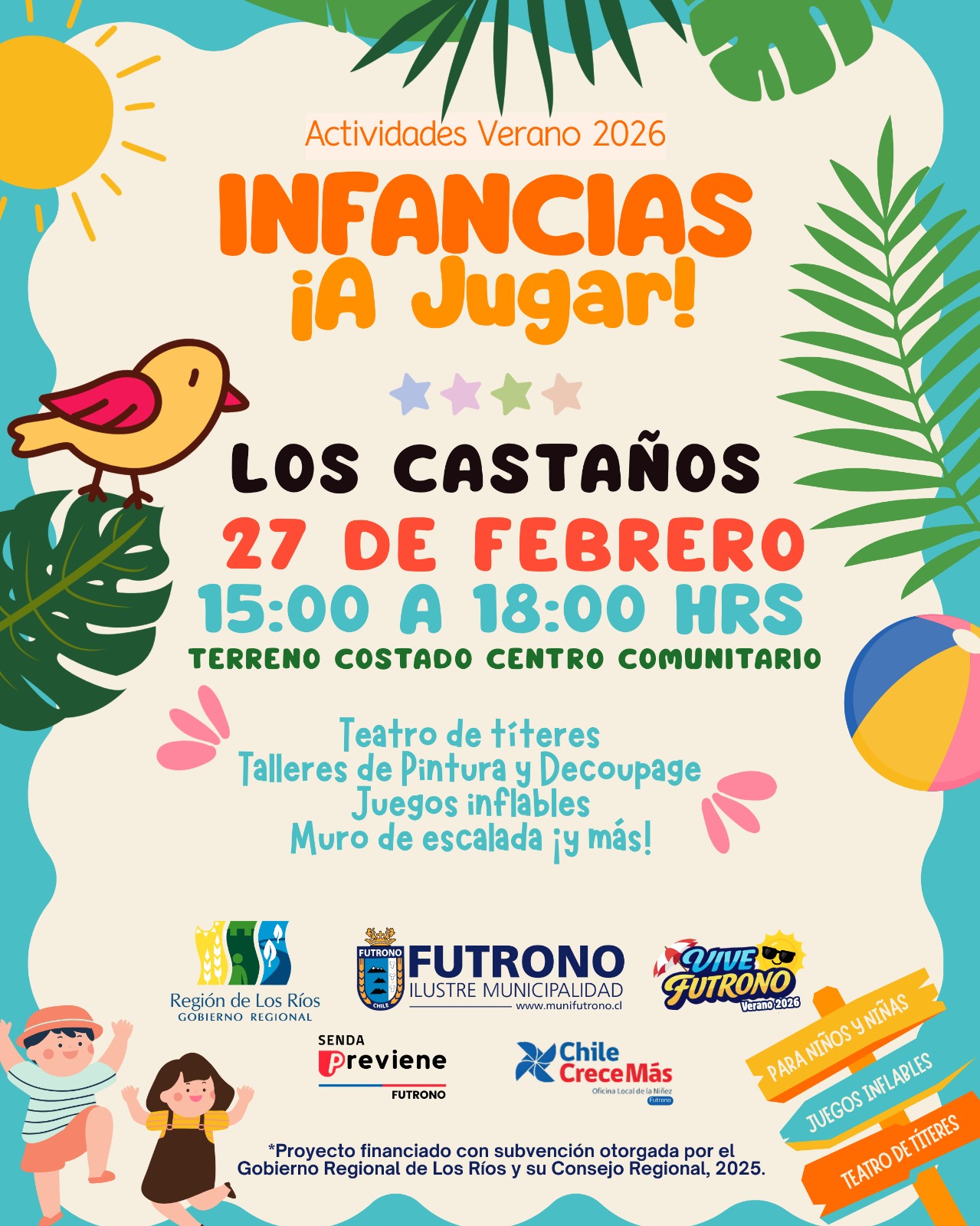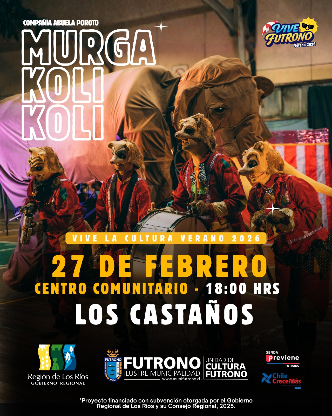 El jueves 27 de febrero, la programación continuará en el sector Los Castaños. A las 15:00 horas se desarrollará una nueva jornada de “Infancias ¡A Jugar!” en el terreno contiguo al centro comunitario, replicando la oferta de teatro de títeres, talleres artísticos, juegos inflables y muro de escalada. Más tarde, a las 18:00 horas, el Centro Comunitario del sector recibirá a la Compañía Abuela Poroto con el montaje “Murga Koli Koli”, espectáculo familiar que combina música, teatro y despliegue escénico.