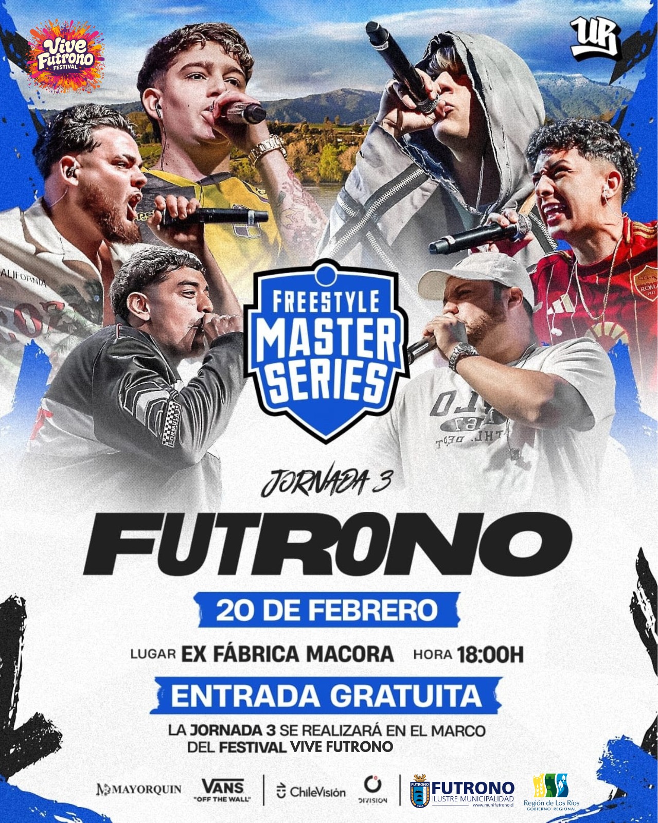 Ese mismo día, a las 18:00 horas, la ex Fábrica Macora será sede de la tercera jornada de la Freestyle Master Series (FMS), una de las competencias más importantes del freestyle a nivel nacional e internacional. El evento, con entrada gratuita y enmarcado en el Festival Vive Futrono, reunirá a destacados exponentes de la disciplina, consolidando a la comuna como un punto de encuentro para la cultura urbana.