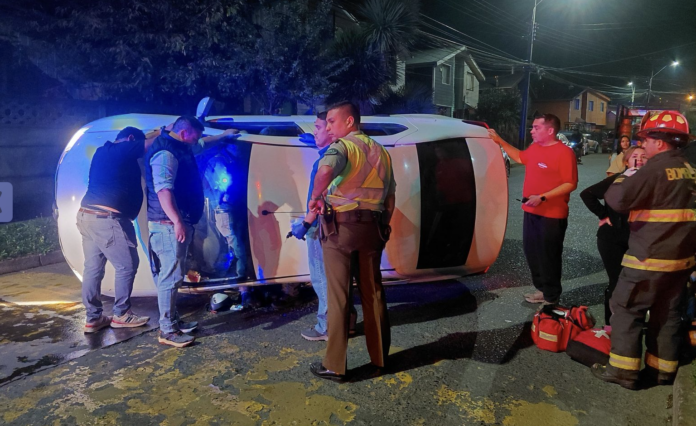 Un accidente de tránsito ocurrido la noche de este lunes 9 de marzo en la intersección de calle Las Heras con pasaje Volcán Osorno, en Río Bueno, dejó tres personas lesionadas. Dos de los ocupantes del vehículo debieron ser rescatados por Bomberos, mientras que equipos de salud y Carabineros también acudieron al lugar.