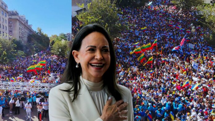 Un masivo encuentro con la comunidad venezolana residente en Chile encabezó este jueves la líder opositora María Corina Machado en pleno centro de Santiago, donde se congregaron cerca de 16 mil personas en las inmediaciones de Parque Almagro con Paseo Bulnes.