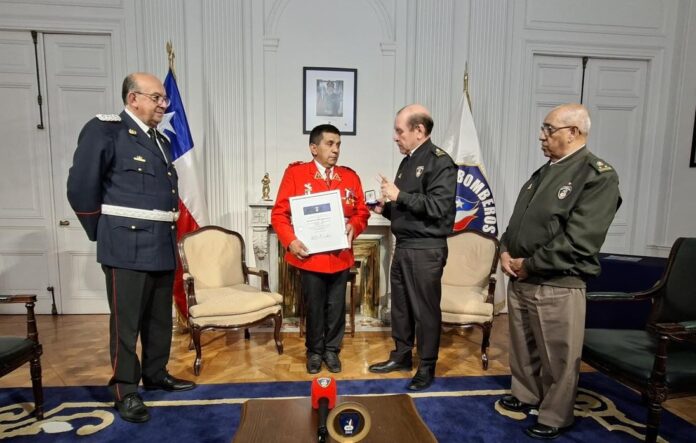 Se trata del Teniente Primero de la 3ª Compañía “Las Heras”, Dagoberto Ríos Silva, quien recibió el Diploma y la Medalla al Valor, distinción que reconoce su valentía, compromiso y permanente vocación de servicio en el ejercicio de sus funciones como bombero.